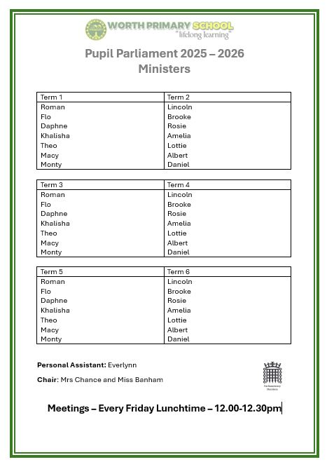 Our pupils have a voice in many ways at Worth Primary School and everyone is listened to, however, our pupils wanted a voice that supported changes in our school. They wanted a voice that supported our school in moving forward and being even better. So, a few years ago our Pupil Parliament was created. It was created by the children and evolves every year.